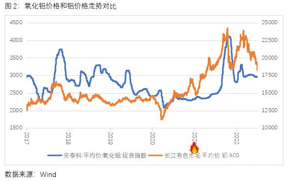 从氧化铝和电解铝2017年以来的价 格走势图中能看出:①大多数情况下,二者的走势方向是保持一致的,说明现货市场中二者上下游的传导机制是有效的。②铝价走势一般要领 先于氧化铝价格,其原因在于一是氧化铝产量的90%以上用于冶炼电解铝,因此,消费用途上的唯 一性使得氧化铝价格明显受制于电解铝市场的景气程度;二是电解铝行业的头部企业多数拥有自身的氧化铝厂,基本实现自给自足,市场上流动的氧化铝主要由小型氧化铝厂和贸易商提供,这种情况下,氧化铝贸易过程中电解铝企业更占据主动权;三是价格传导机制使得氧化铝价格波动滞后,铝价的涨跌影响到电解铝厂的利润空间,利润空间的大小决定了电解铝厂对于氧化铝等原料的需求情况,进而左右了氧化铝的价格。③氧化铝价格波动曲线相对于电解铝更加平滑,因为电解铝作为期 货上市品种,具有较强的金 融属性,除了供需基本面,其价格还会受宏观、资金等因素的影响,价格波动率也会更高一些。